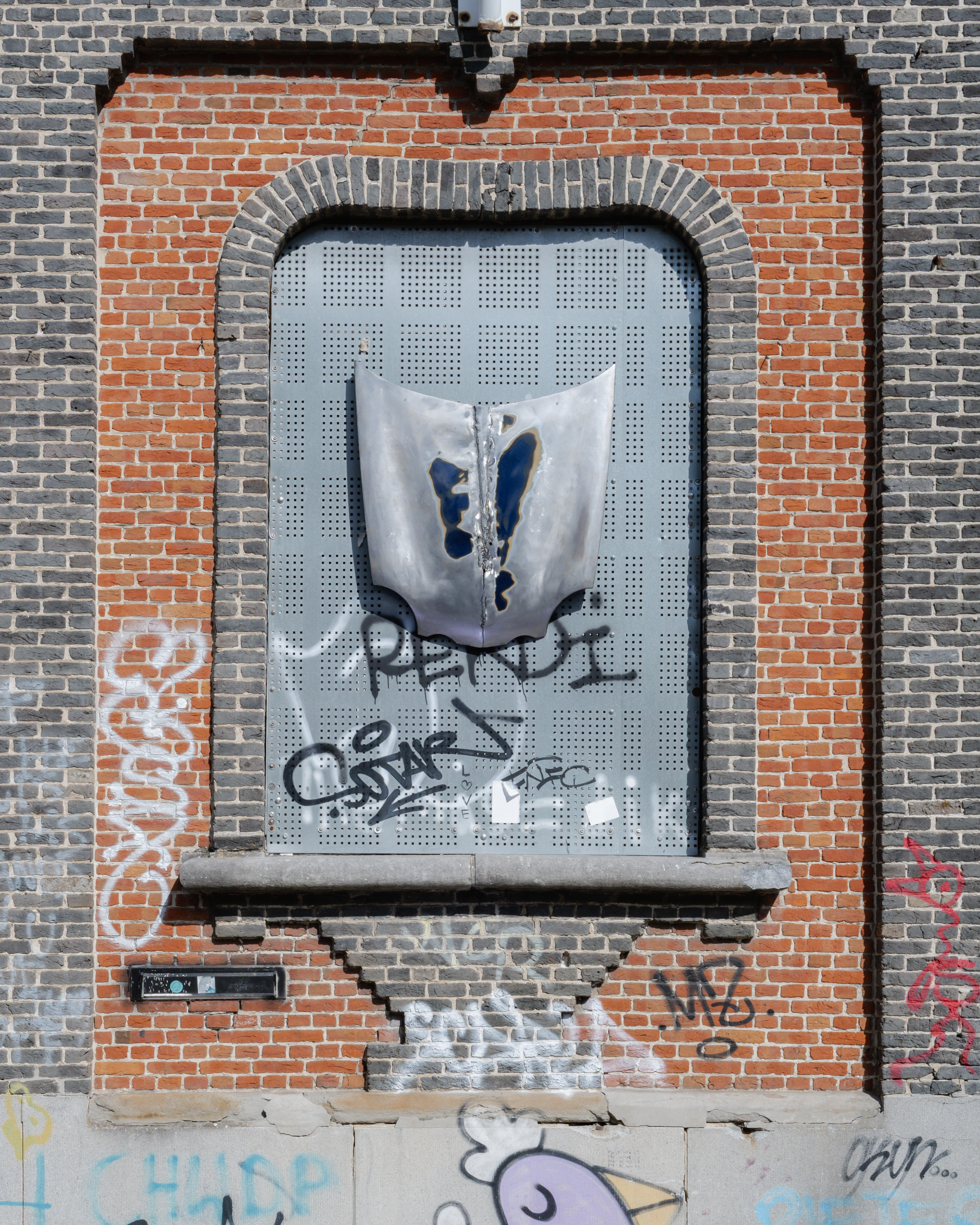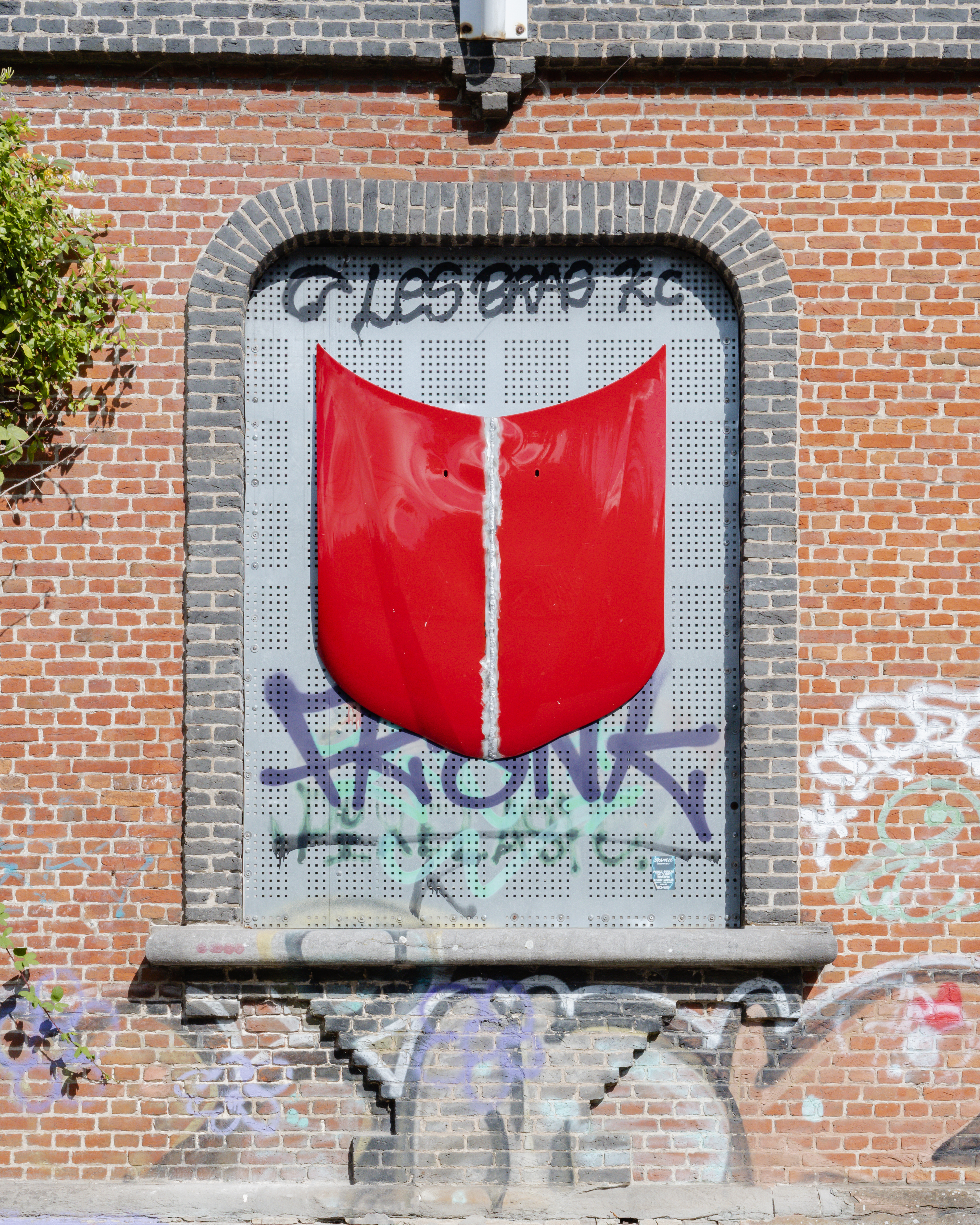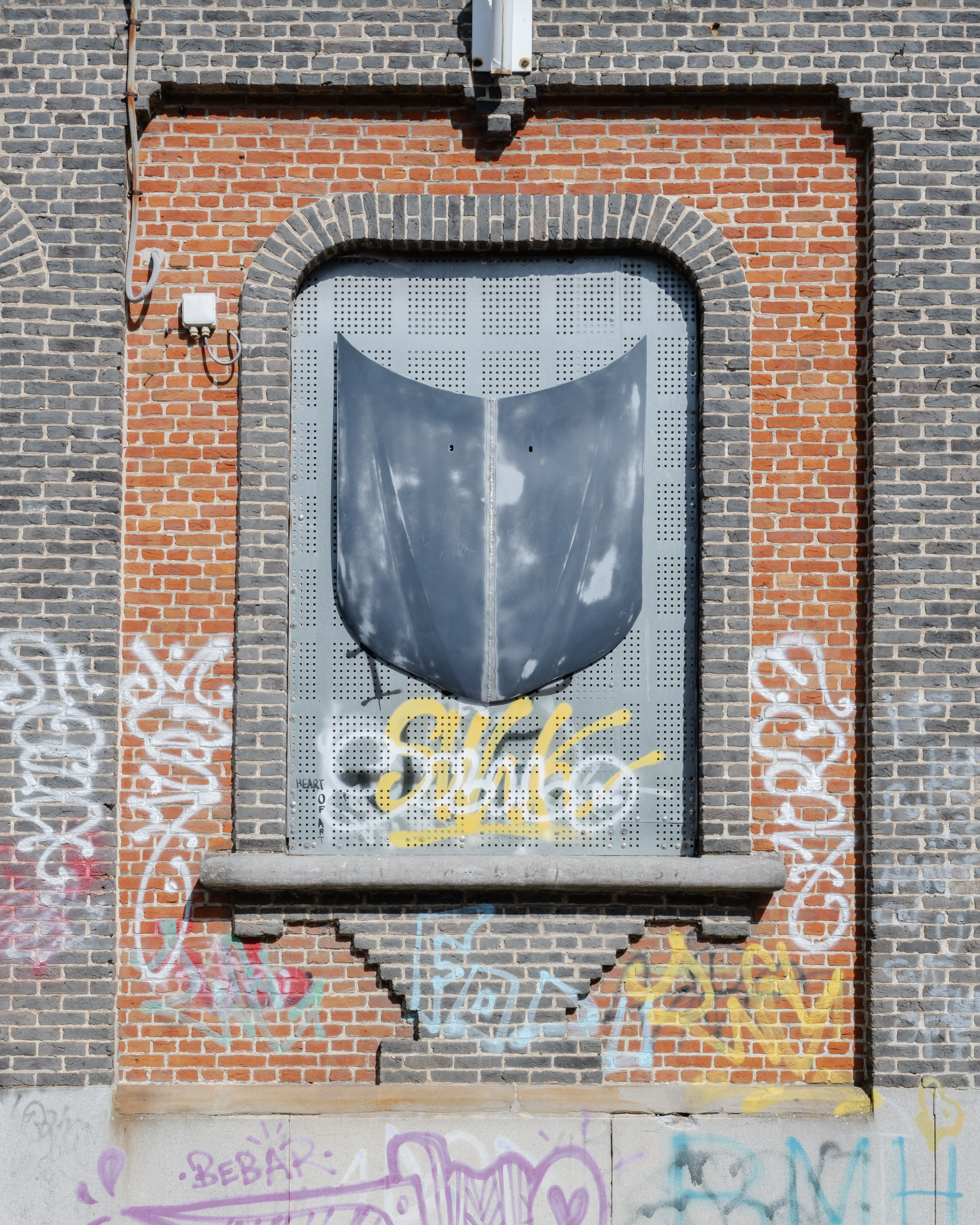 “(...) In addition, Eblé will present a series of metal coats of arms, made from repurposed car hoods, hung on the facade of the old city hall of Doel. These refer to tuning and car culture, expressions of personal identity, highly visible in Doel due to the weekly visits of car and tuning enthusiasts who use the village as a meeting spot and as a backdrop for photographing their vehicles. The coats of arms can also be seen as symbols of Doel as a final frontier, a bastion held up by activist groups and squatter communities.”