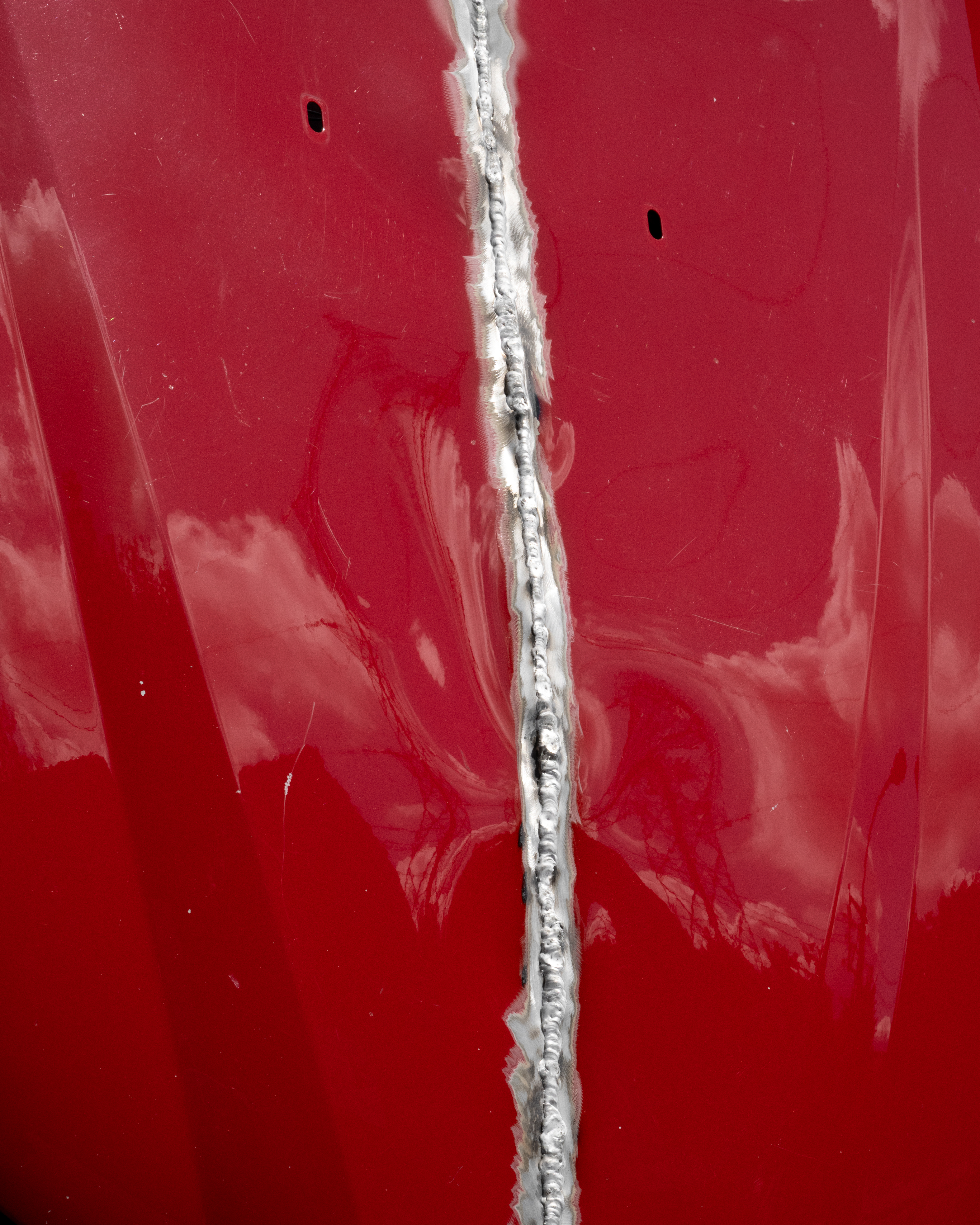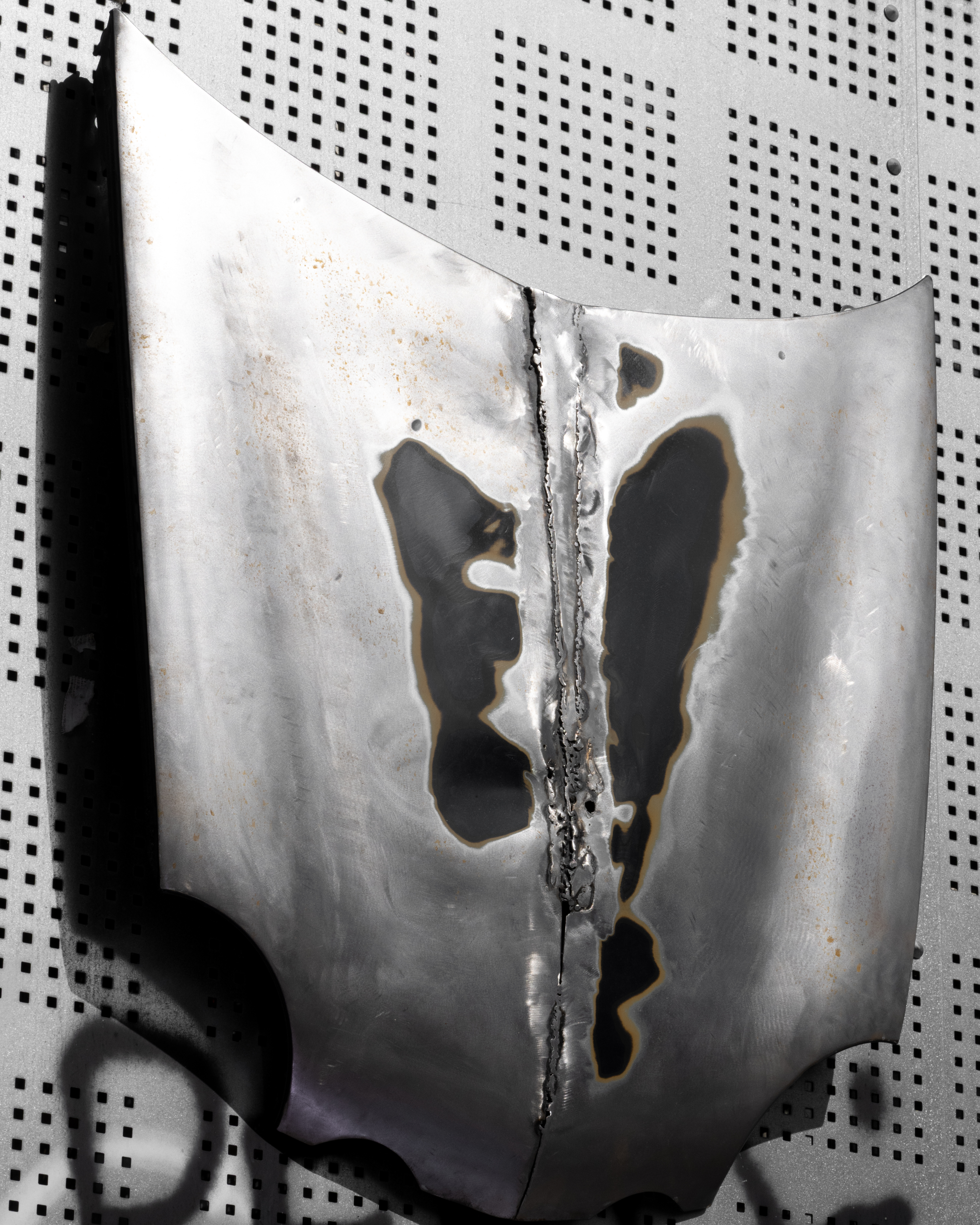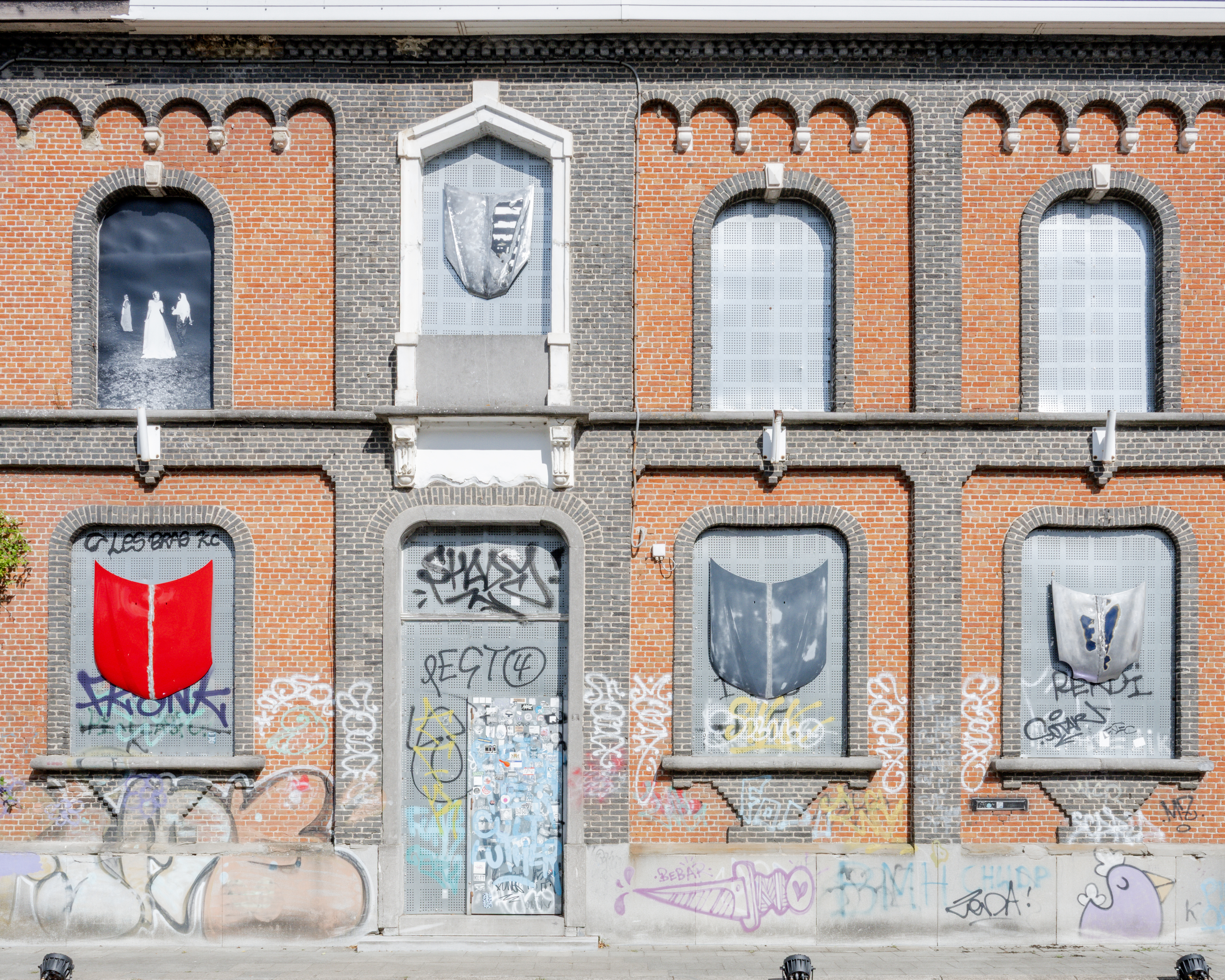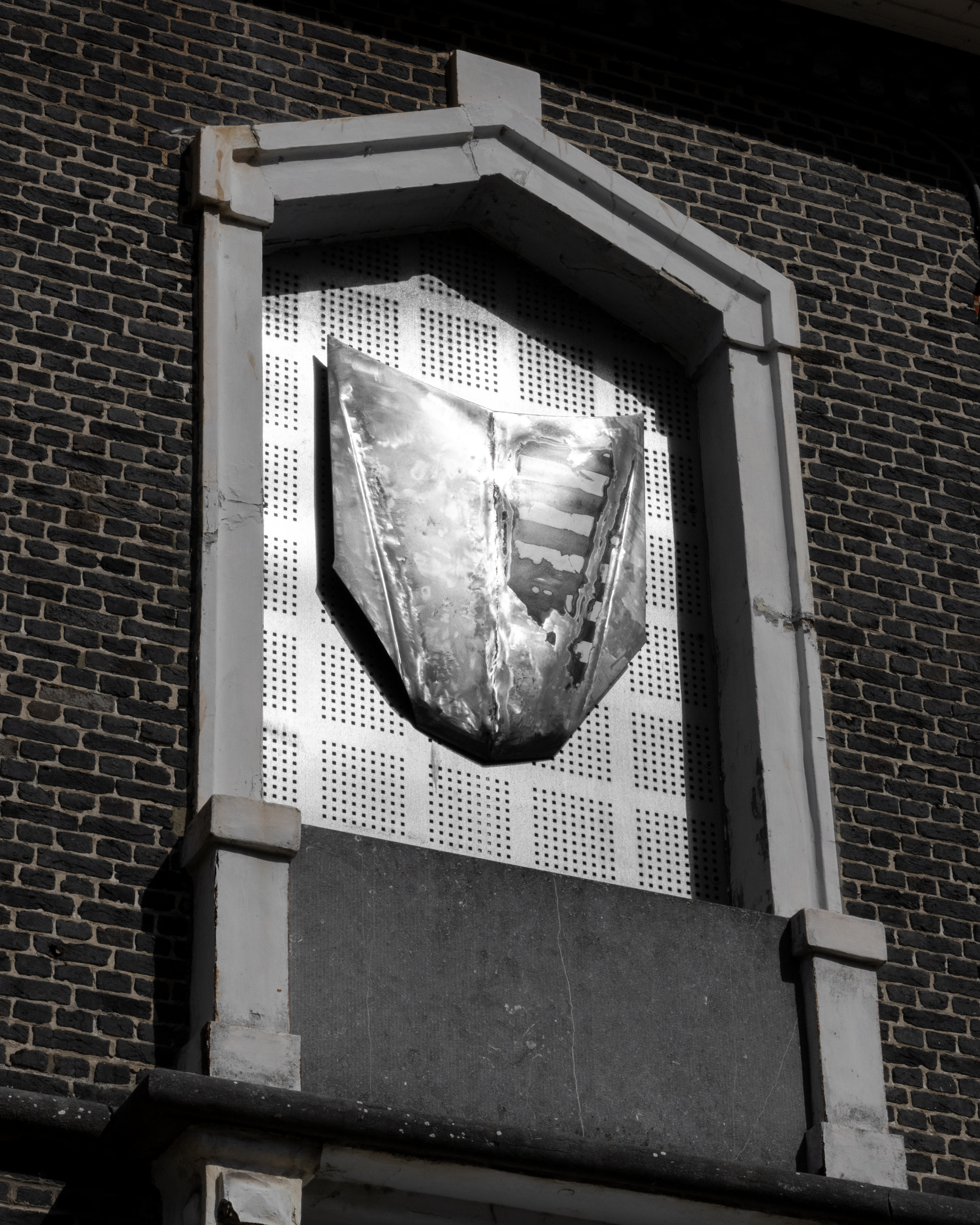 “(...) In addition, Eblé will present a series of metal coats of arms, made from repurposed car hoods, hung on the facade of the old city hall of Doel. These refer to tuning and car culture, expressions of personal identity, highly visible in Doel due to the weekly visits of car and tuning enthusiasts who use the village as a meeting spot and as a backdrop for photographing their vehicles. The coats of arms can also be seen as symbols of Doel as a final frontier, a bastion held up by activist groups and squatter communities.”