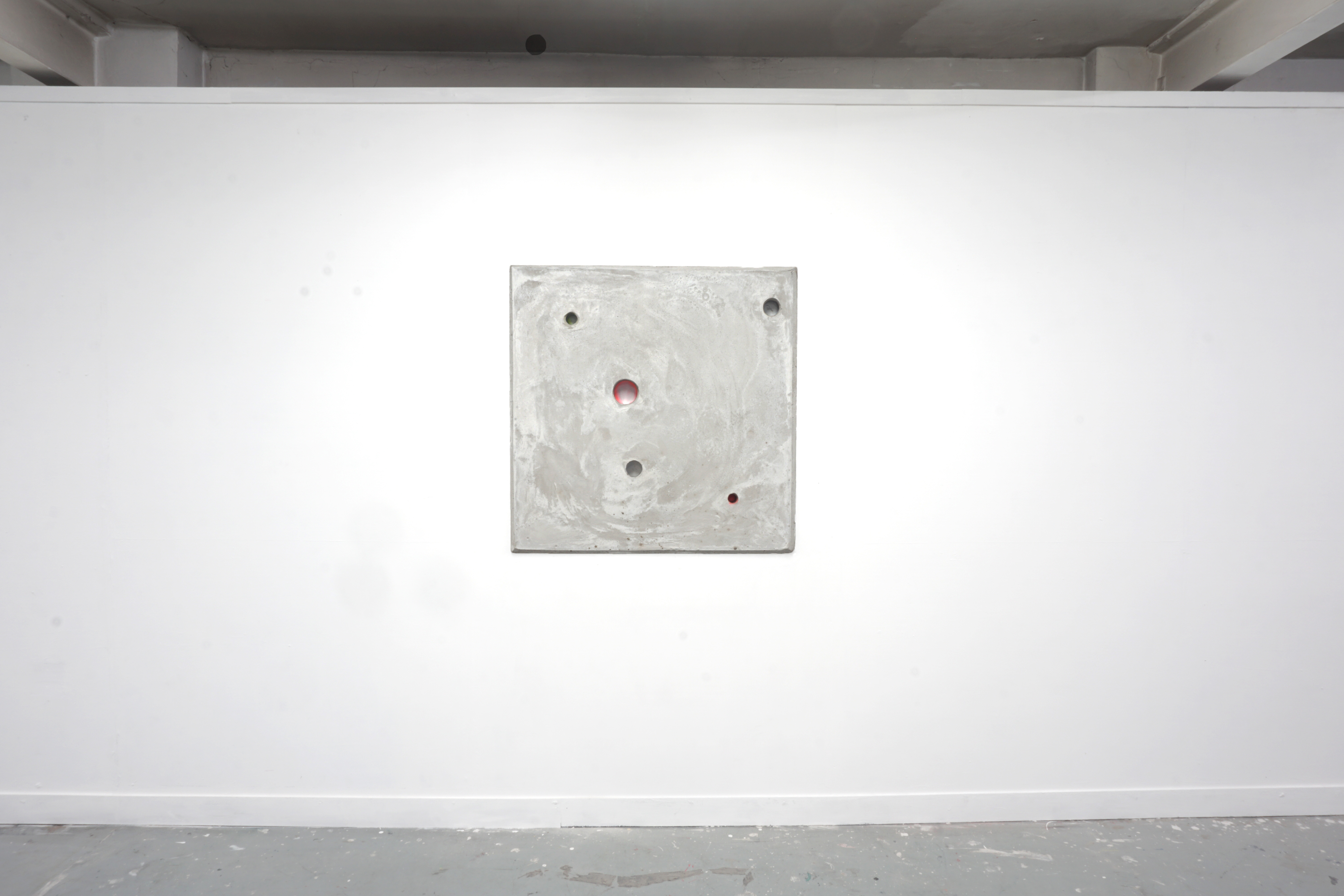Spray paint traces and acrylic paint on concrete plywood in metal frame